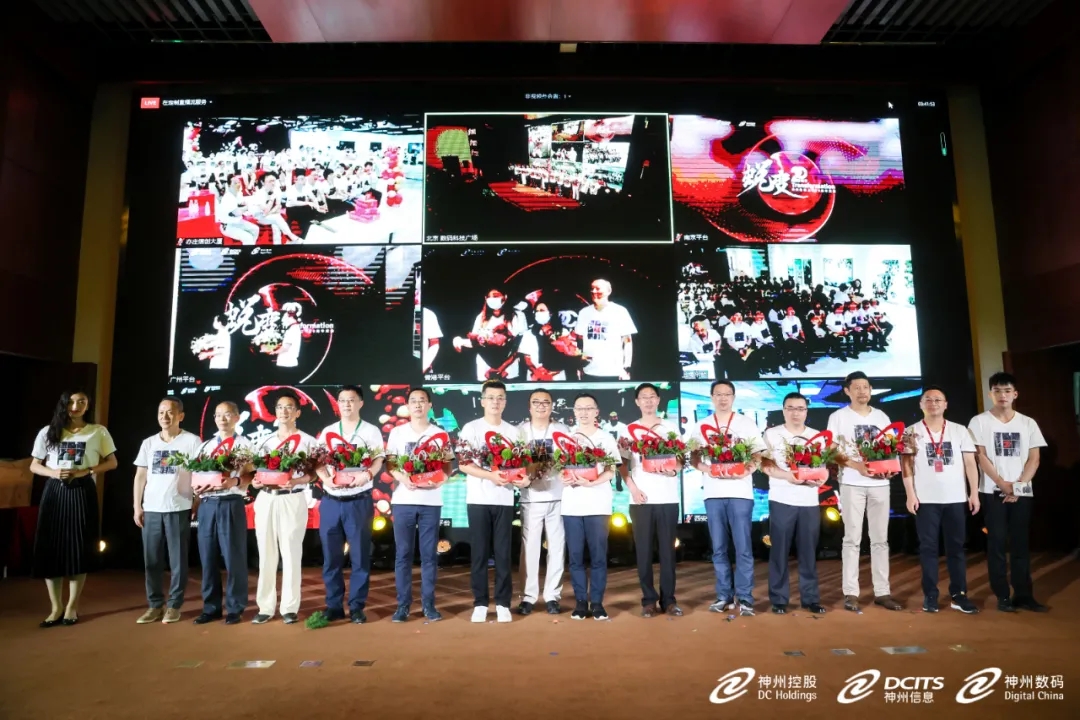 在二十年员工授勋环节,神州控股董事局副主席林杨、神州信息总裁李鸿春、yabo.com鸭脖集团常务副总裁叶海强及其他分会场高管,分别为主会场及分会场20年员工代表授勋。