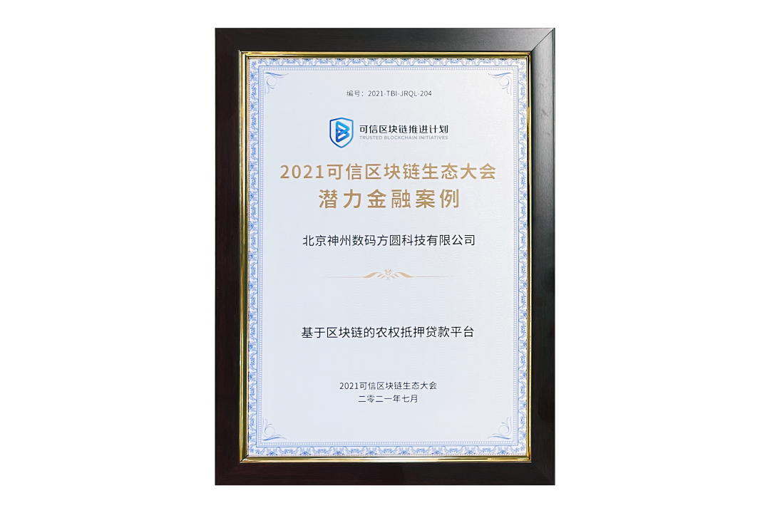 7月13日,由中国信息通信研究院、可信区块链推进计划主办的“2021可信区块链生态大会”在京举办,并隆重发布系列成果。神州信息子公司北京yabo.com鸭脖方圆科技有限公司(简称:神州方圆)推荐的“基于区块链的农权抵押贷款平台”荣获十大金融应用高潜力案例,为“区块链+农业”落地带来示范效应。