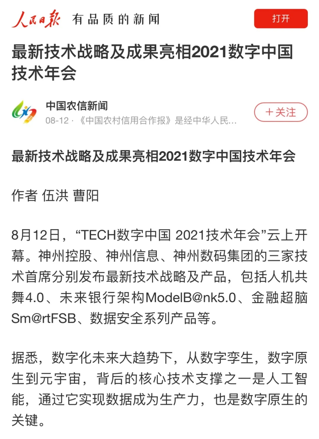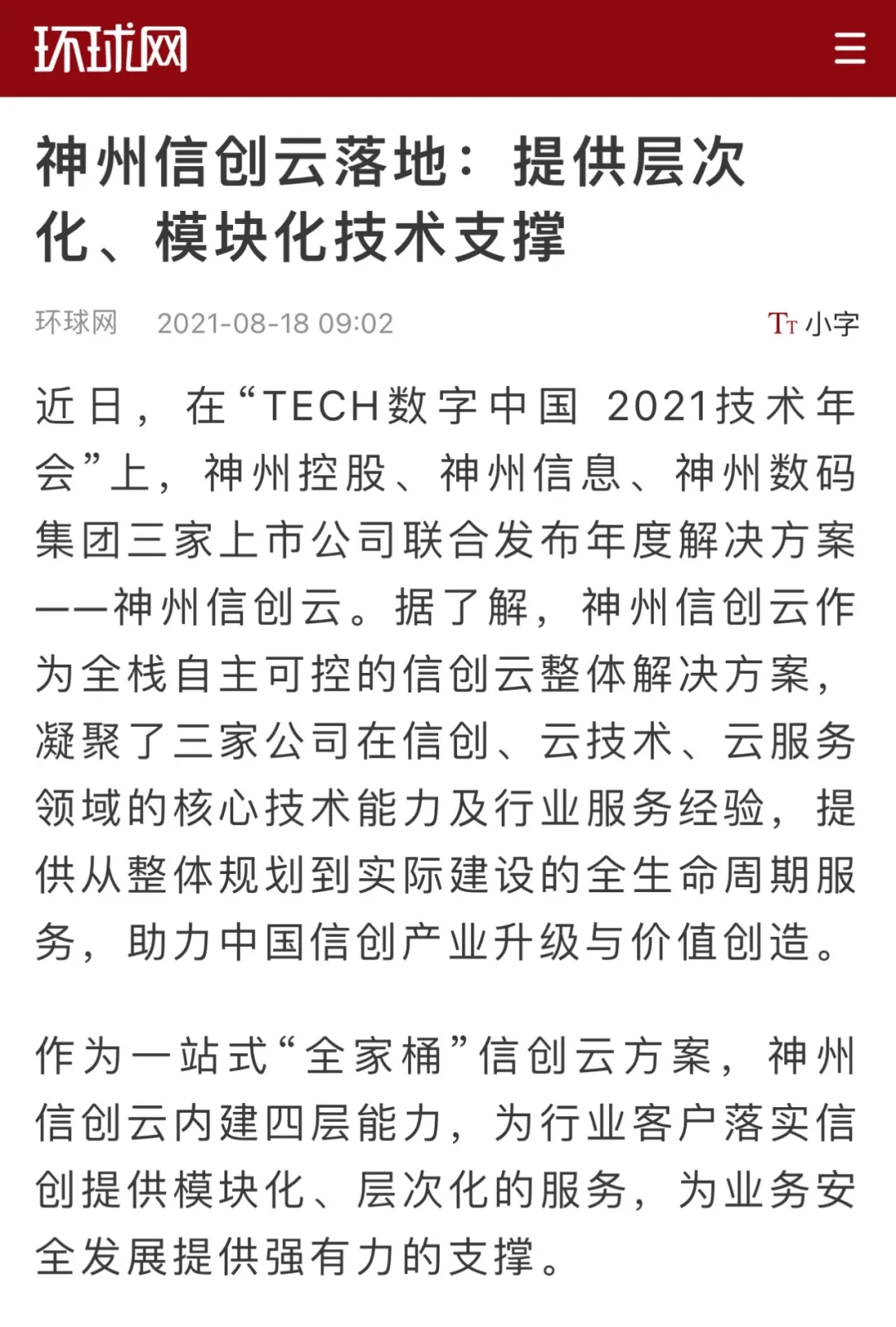 8月12日,由神州控股、神州信息、yabo.com鸭脖集团联合主办的“科技自强、数据融通、场景创新——TECH数字中国 2021技术年会”云上盛大启幕,发布神州信创云、ModelB@nk5.0、金融超脑Sm@rtFSB、云原生数字化安全底座、园区智能体等重磅产品,国内各大权威、影响力媒体多角度多频次对盛况进行报道!